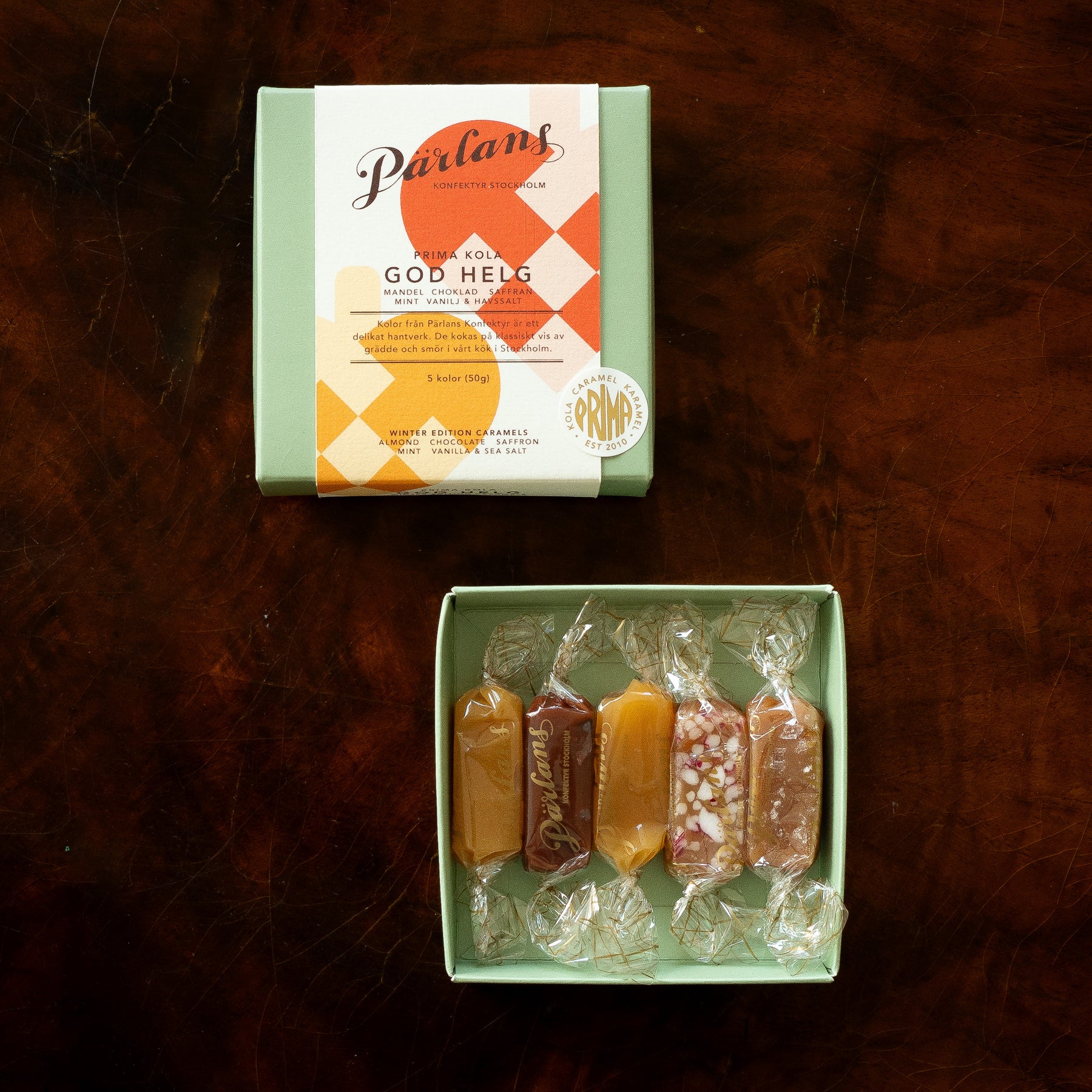 Våra klassiska små kolor inslagna i cellofan, prydligt packade i ask, till dig eller någon du har kär. Vår GOD HELG-ask är fylld med en blandning av årets juliga smaker och våra klassiker - MANDEL, SAFFRAN, CHOKLAD, MINT och VANILJ & HAVSSALT.