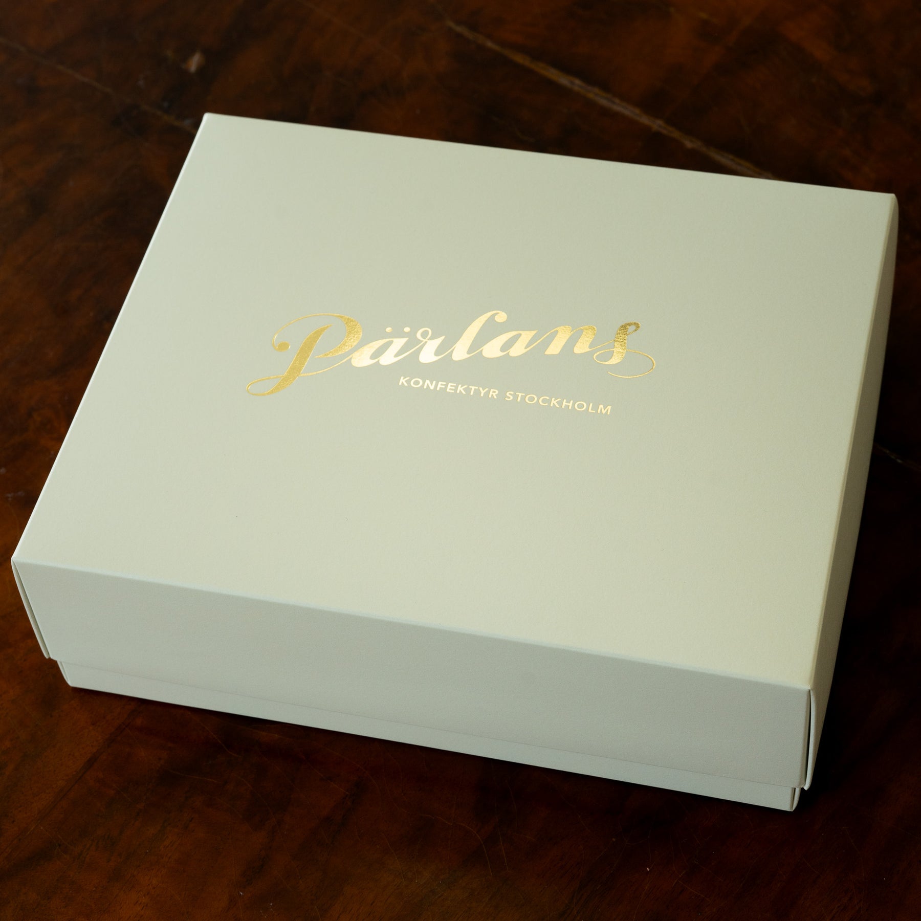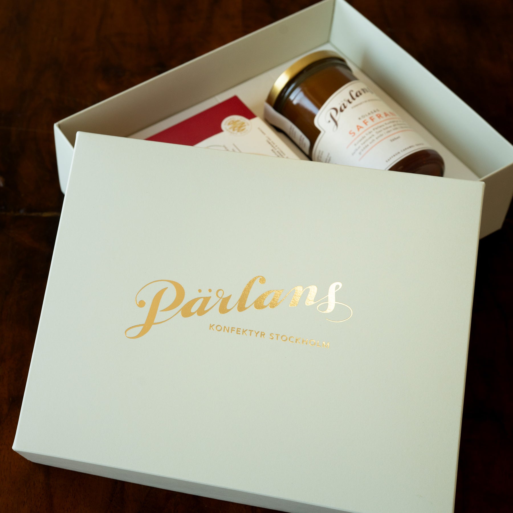 Pärlans presentlåda i ljust grön med guldlogotyp, fylld med två juliga favoriter; kola i choklad GOD HELG 12 bitar och kolasås SAFFRAN glasburk.