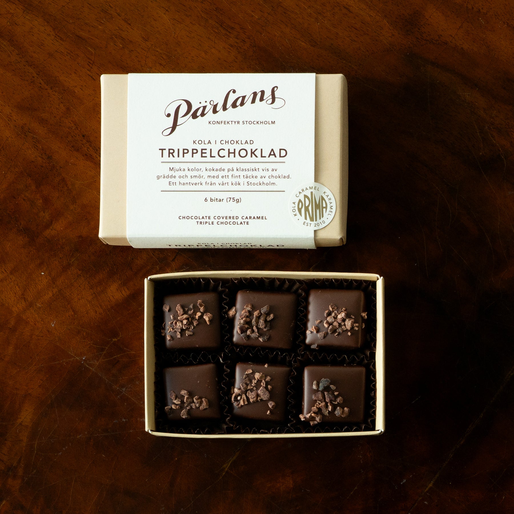 INGREDIENSER Socker, grädde, glykossirap, smör, choklad (kakaomassa, socker, kakaosmör, emulgeringsmedel solroslecitin), kakaobönor och havssalt. Kan innehålla spår av nötter. Bäst inom 12 veckor. 6 bitar (75g).