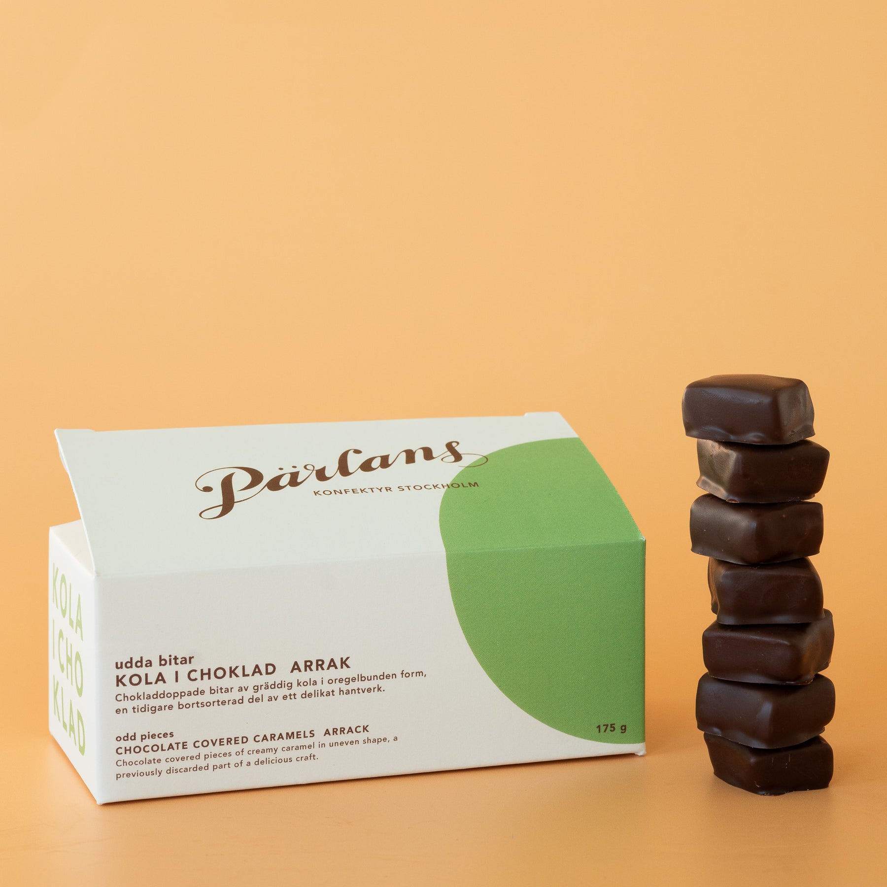 Vår klassiska kola doppad i mörk eller ljus choklad. Här i lite mindre och ojämnare format som därför inte passar i våra vanliga askar. Ibland behöver det inte vara så tjusigt, det räcker med att det smakar väldigt gott. Unna dig en låda eller två av din favorit!
